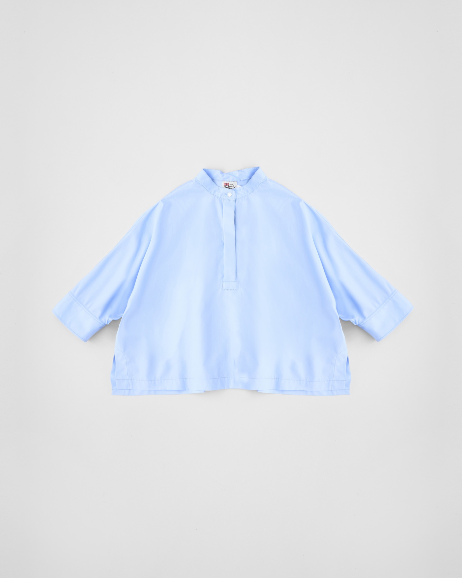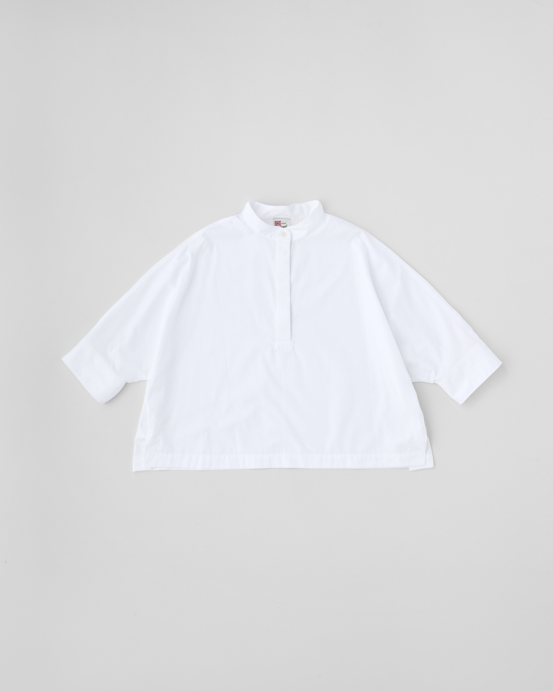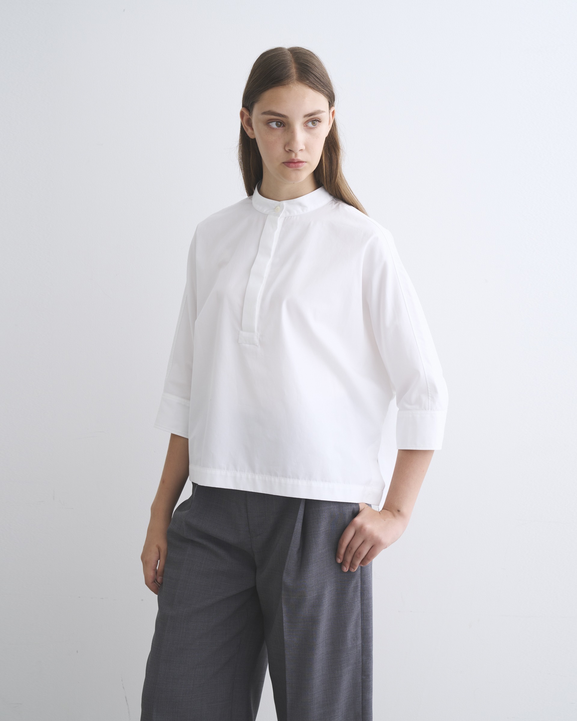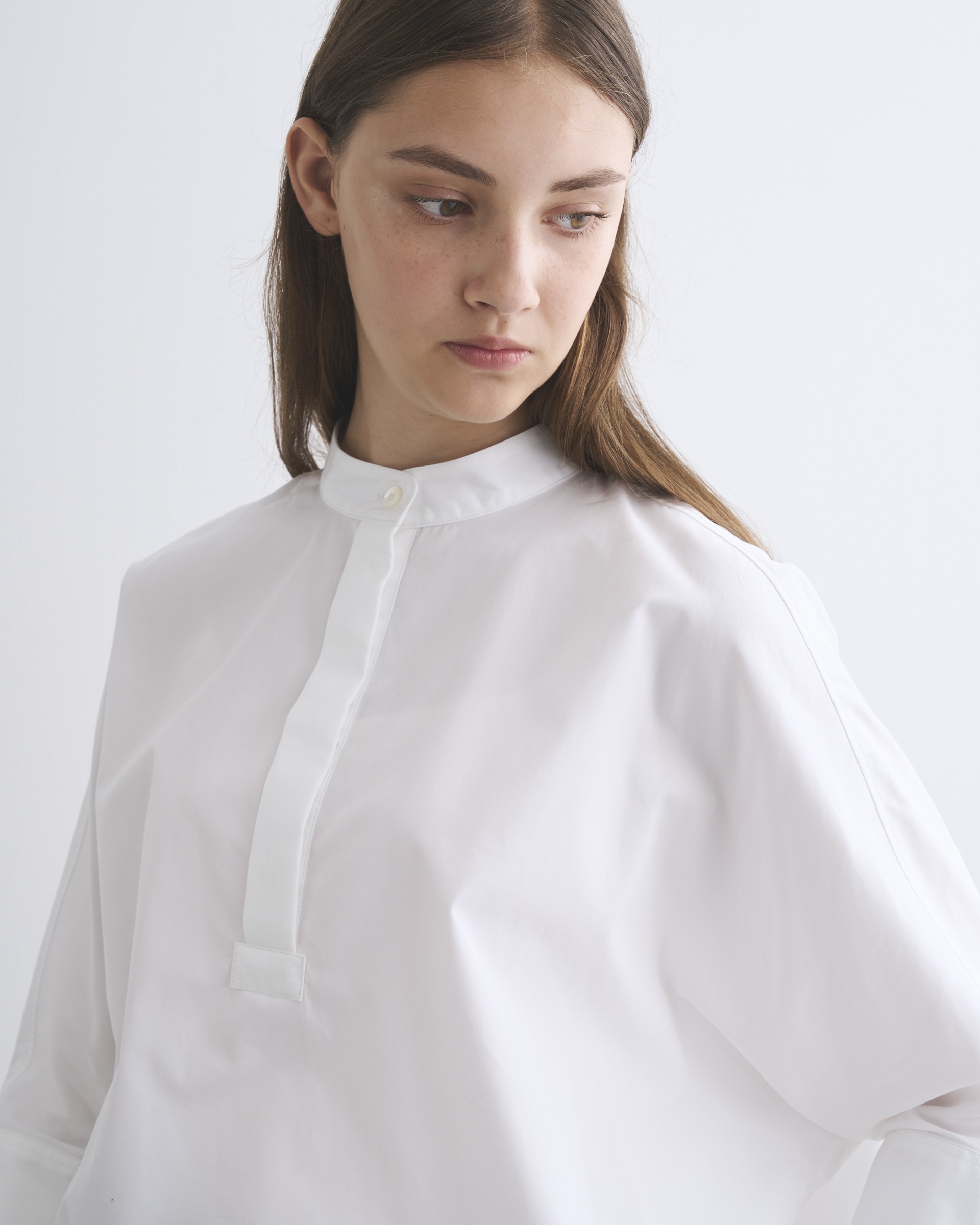 こちらのバーネットは、ブランド独自のドロップショルダーと、ゆったりとした身幅が生み出すAラインシルエットが特長のプルオーバータイプのシャツです。僅かに前後差をつけた、直線的な裾の仕様は、クリーンでミニマルな印象に。ドレス感のある装いから、カジュアルなデニムスタイルまで活躍する着る人を選ばない万能シャツです。細番手の繊細な糸を高密度に織り上げたコットンのポプリン素材なのでしっかりとしたハリがあり、立体的なシルエットが際立ちます。肌触りもドライで通年使用できる優れものです。