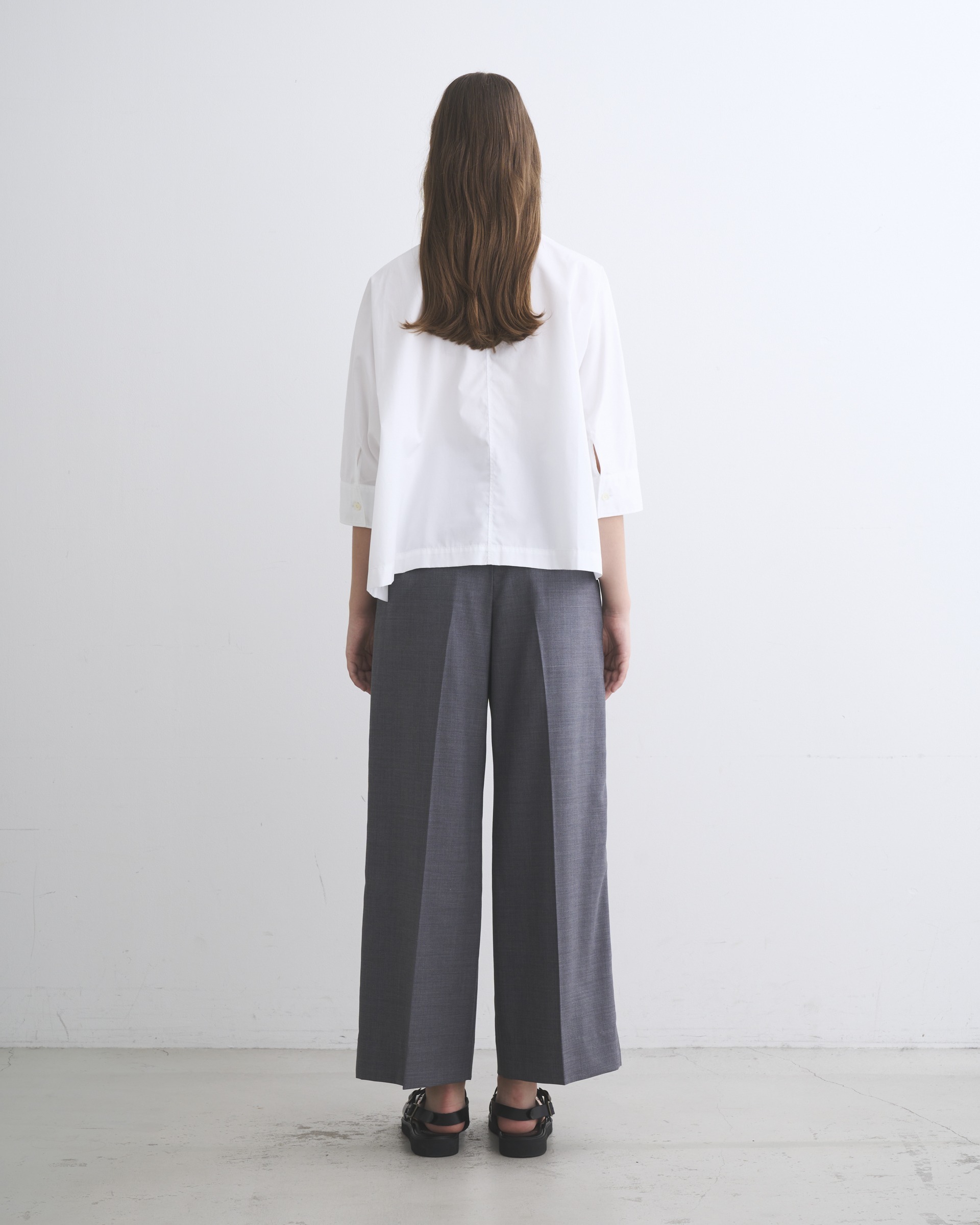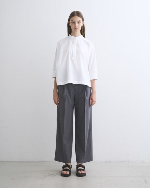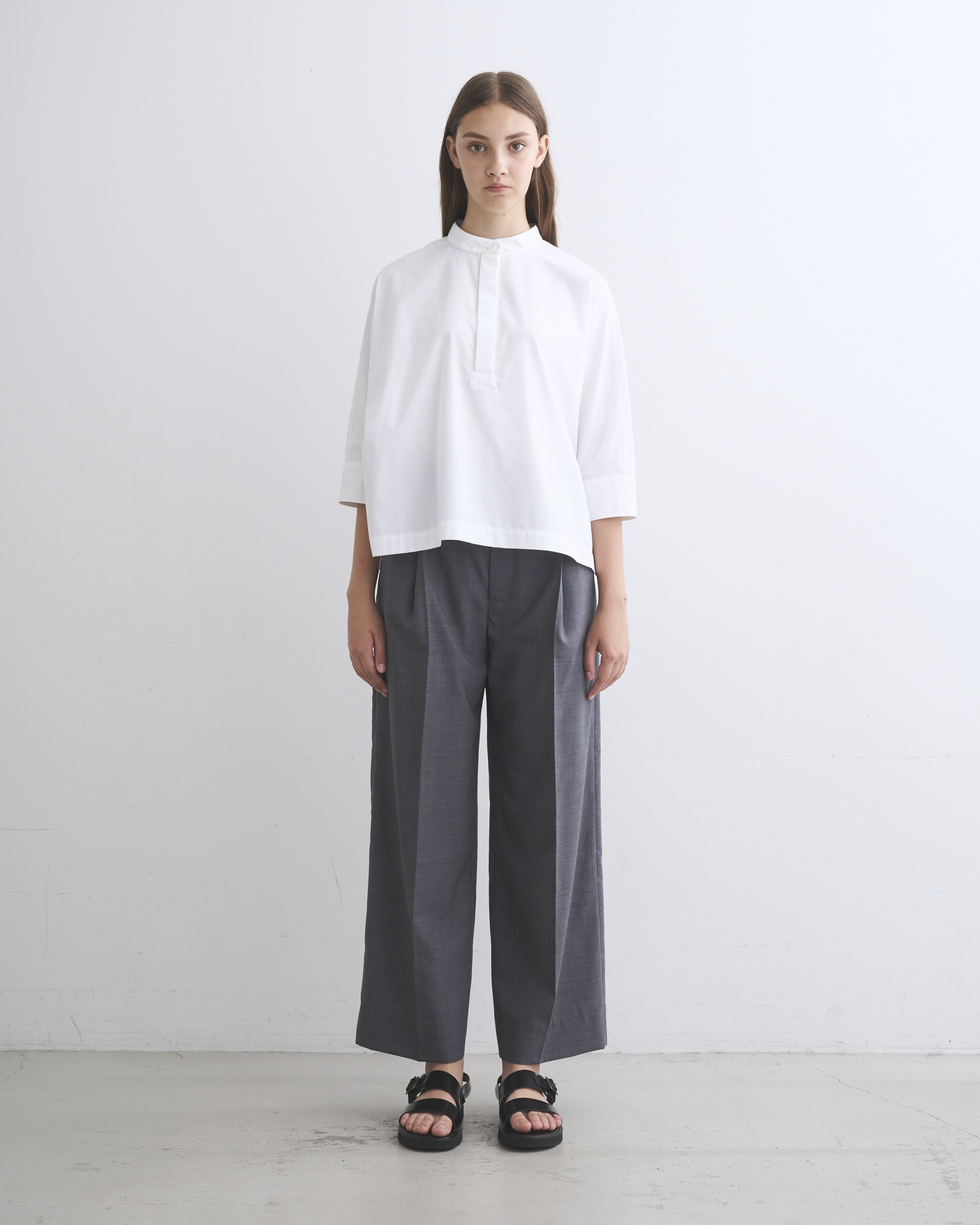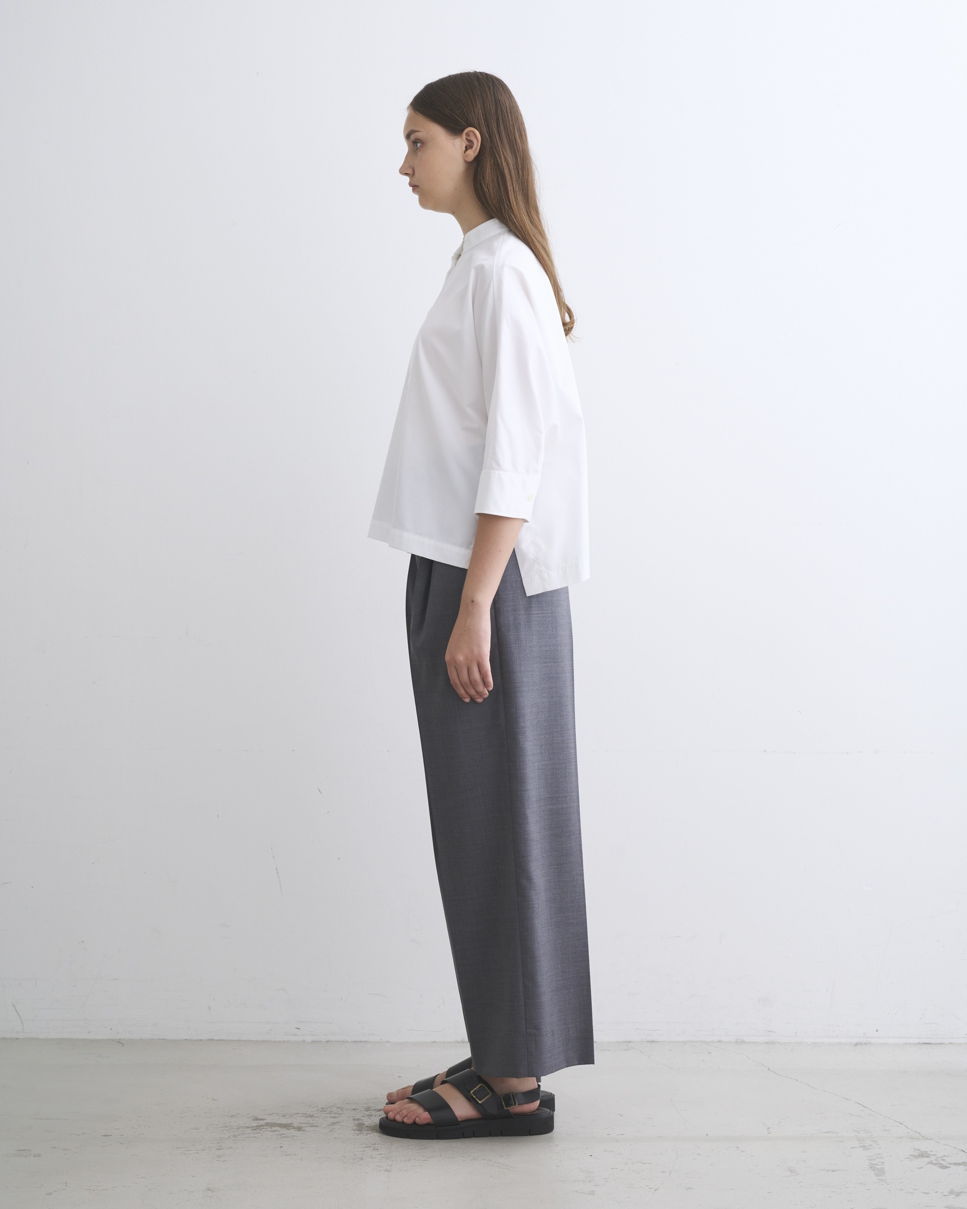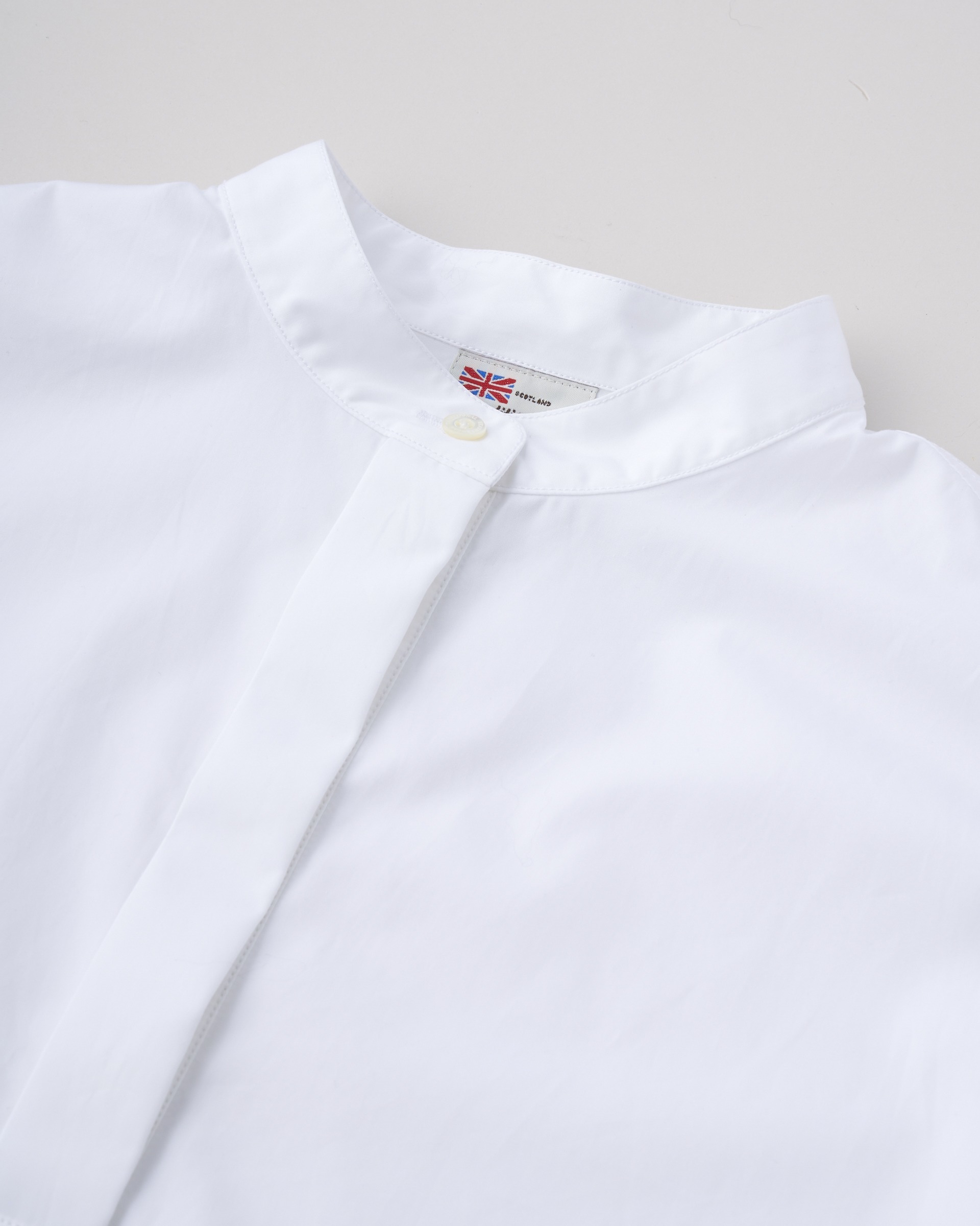 こちらのバーネットは、ブランド独自のドロップショルダーと、ゆったりとした身幅が生み出すAラインシルエットが特長のプルオーバータイプのシャツです。僅かに前後差をつけた、直線的な裾の仕様は、クリーンでミニマルな印象に。ドレス感のある装いから、カジュアルなデニムスタイルまで活躍する着る人を選ばない万能シャツです。細番手の繊細な糸を高密度に織り上げたコットンのポプリン素材なのでしっかりとしたハリがあり、立体的なシルエットが際立ちます。肌触りもドライで通年使用できる優れものです。
