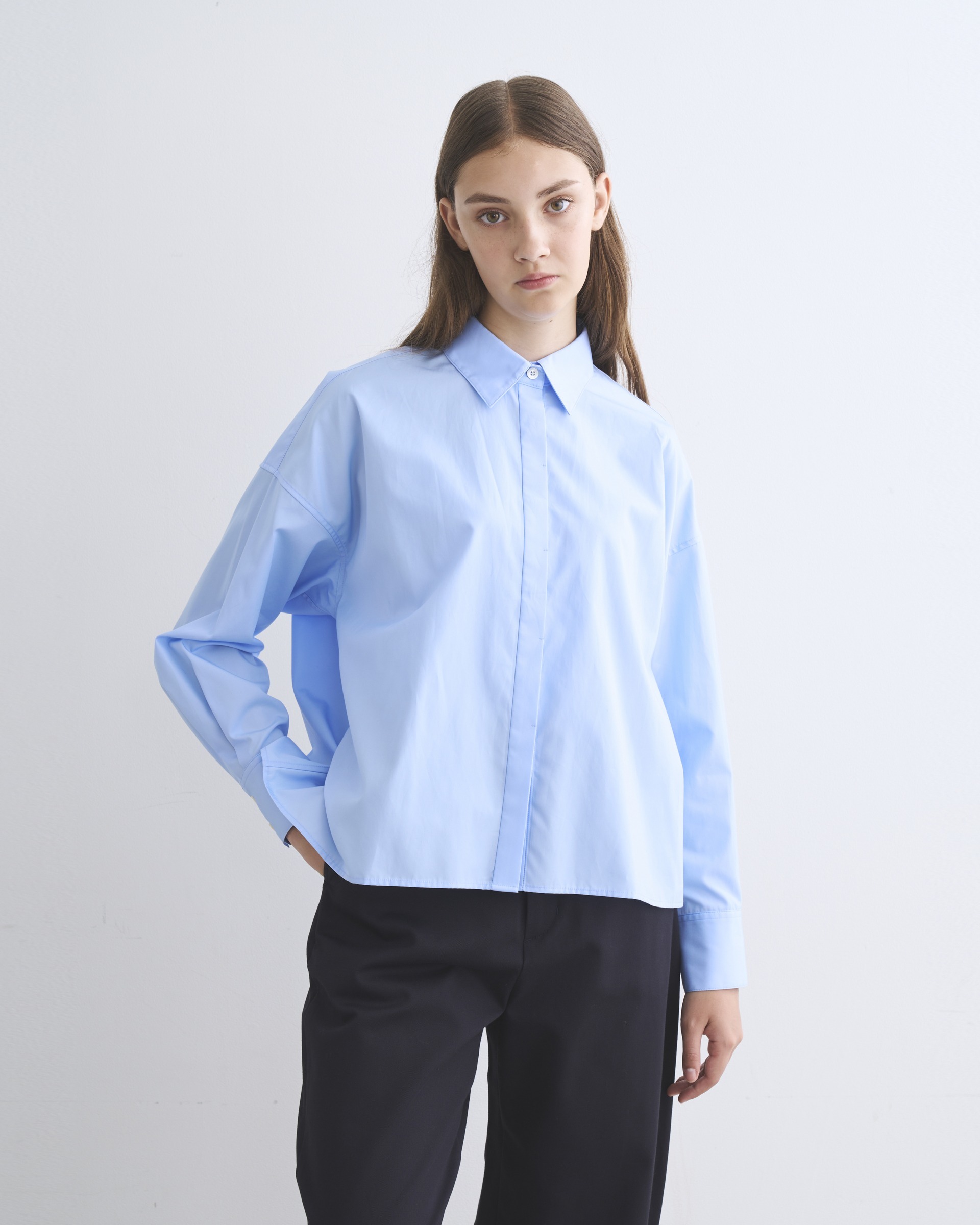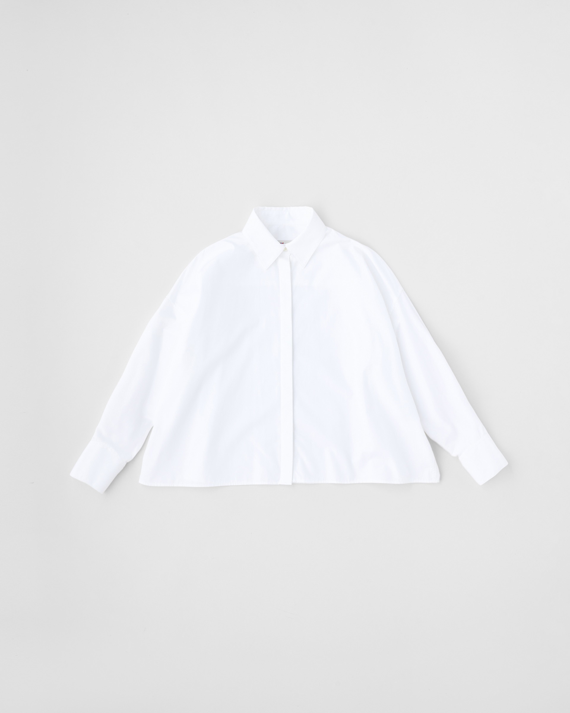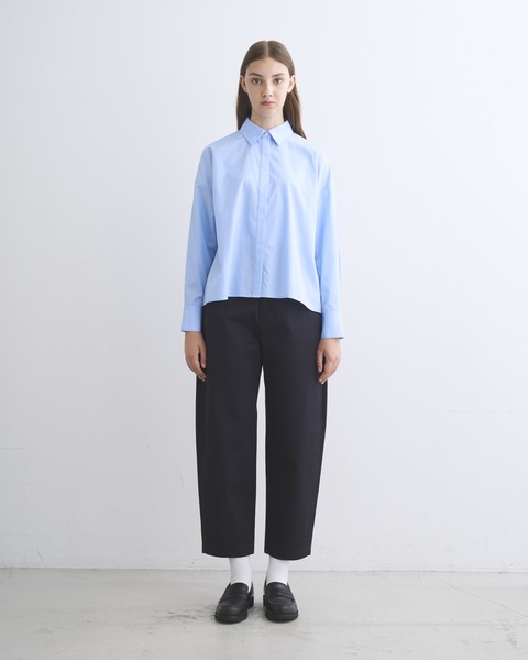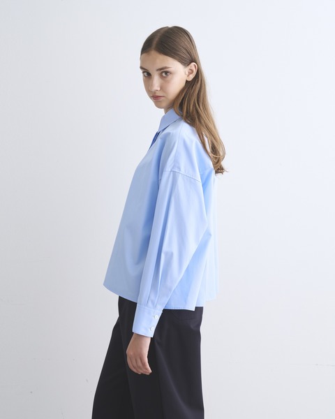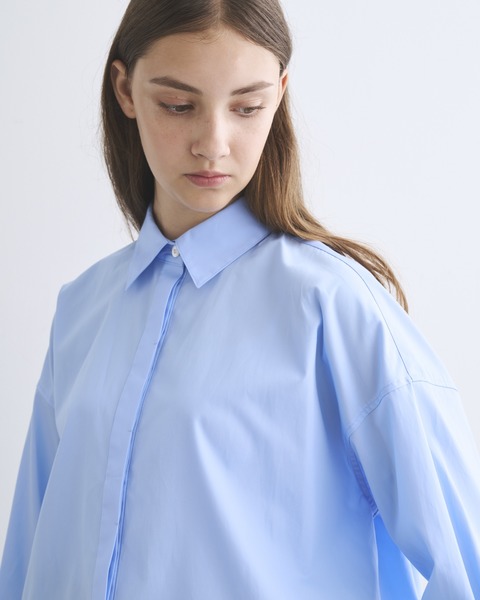 程よいドロップショルダーと、ゆったりした身幅が生み出すボクシーなシルエットが魅力。直線的な裾の仕様やフロントの比翼仕立てがクリーンでミニマルな印象に。ドレス感のある装いから、カジュアルなデニムスタイルまで活躍する着る人を選ばない万能シャツです。細番手の繊細な糸を高密度に織り上げたコットンのポプリン素材なのでしっかりとしたハリがあり、立体的なシルエットが際立ちます。肌触りもドライで通年使用できる優れものです。