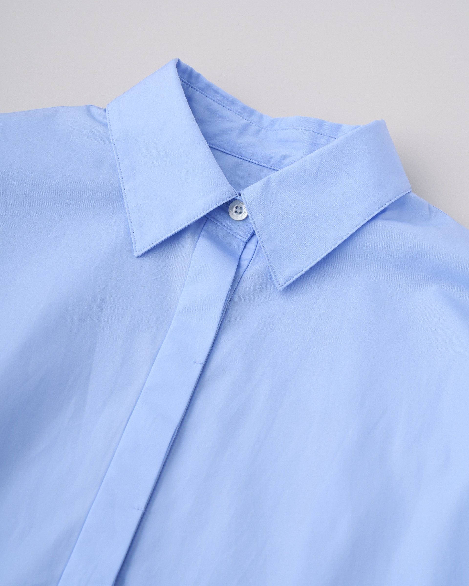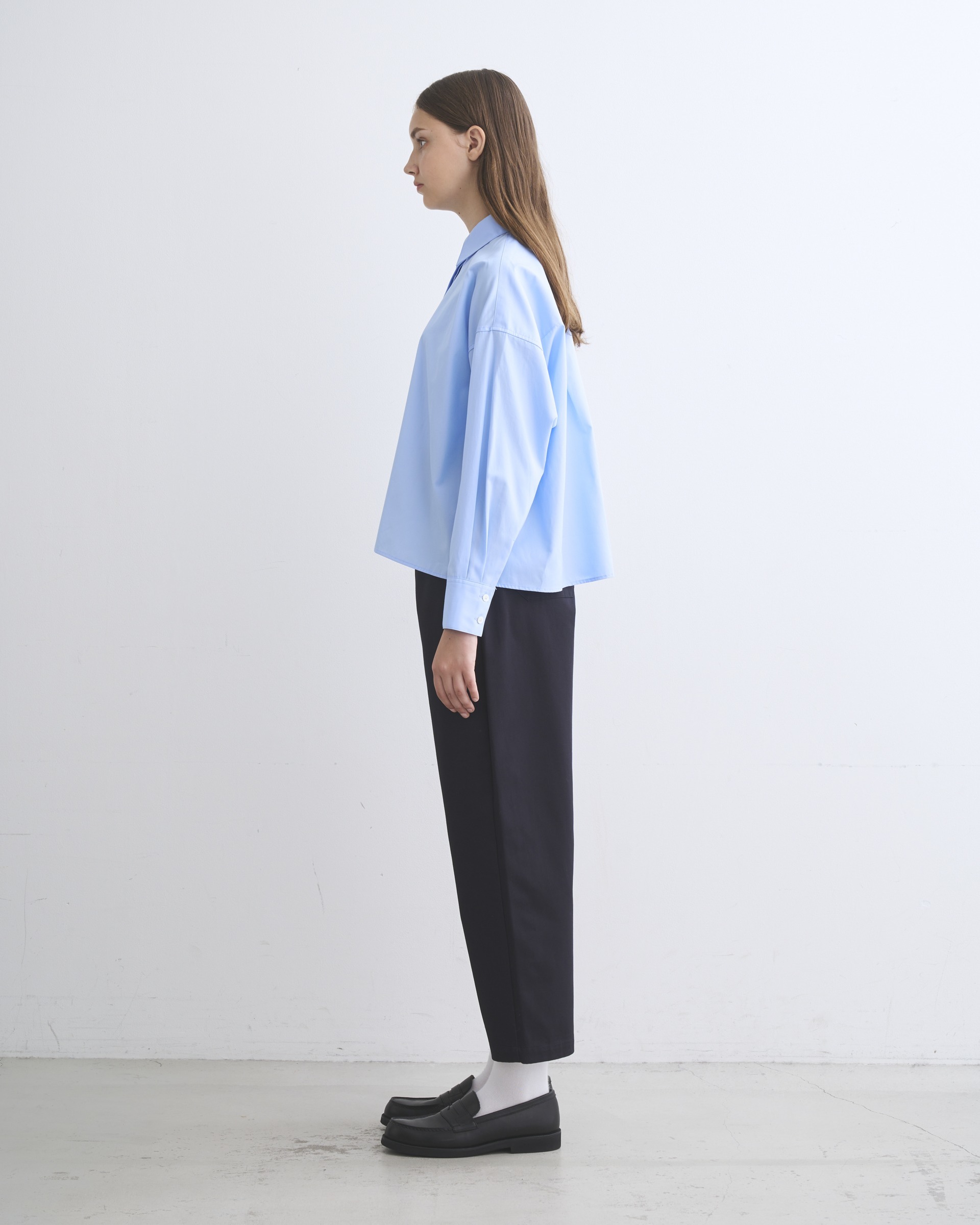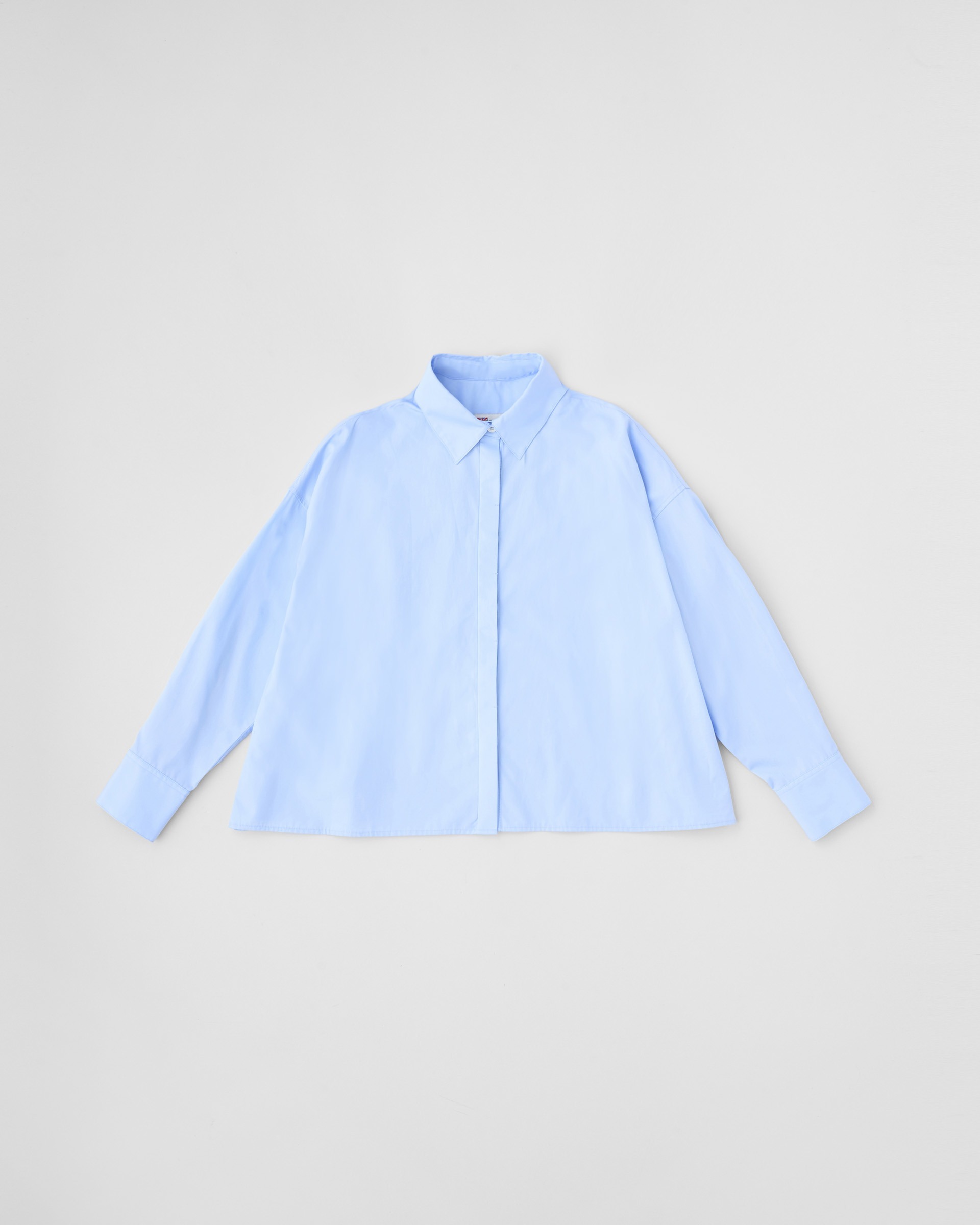 程よいドロップショルダーと、ゆったりした身幅が生み出すボクシーなシルエットが魅力。直線的な裾の仕様やフロントの比翼仕立てがクリーンでミニマルな印象に。ドレス感のある装いから、カジュアルなデニムスタイルまで活躍する着る人を選ばない万能シャツです。細番手の繊細な糸を高密度に織り上げたコットンのポプリン素材なのでしっかりとしたハリがあり、立体的なシルエットが際立ちます。肌触りもドライで通年使用できる優れものです。