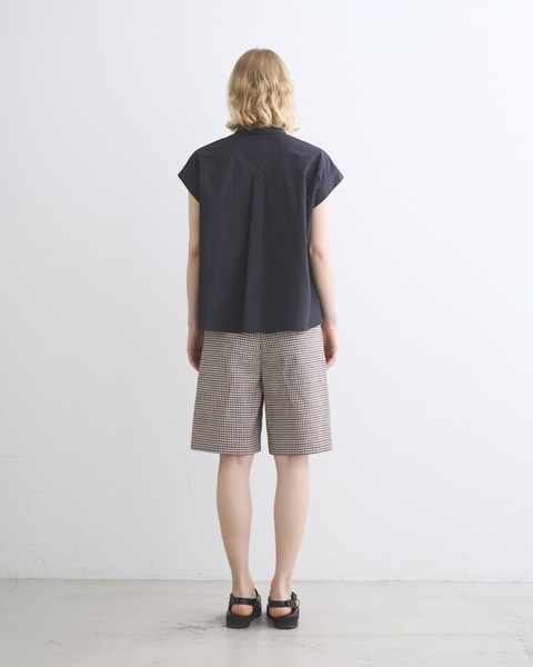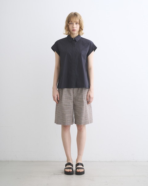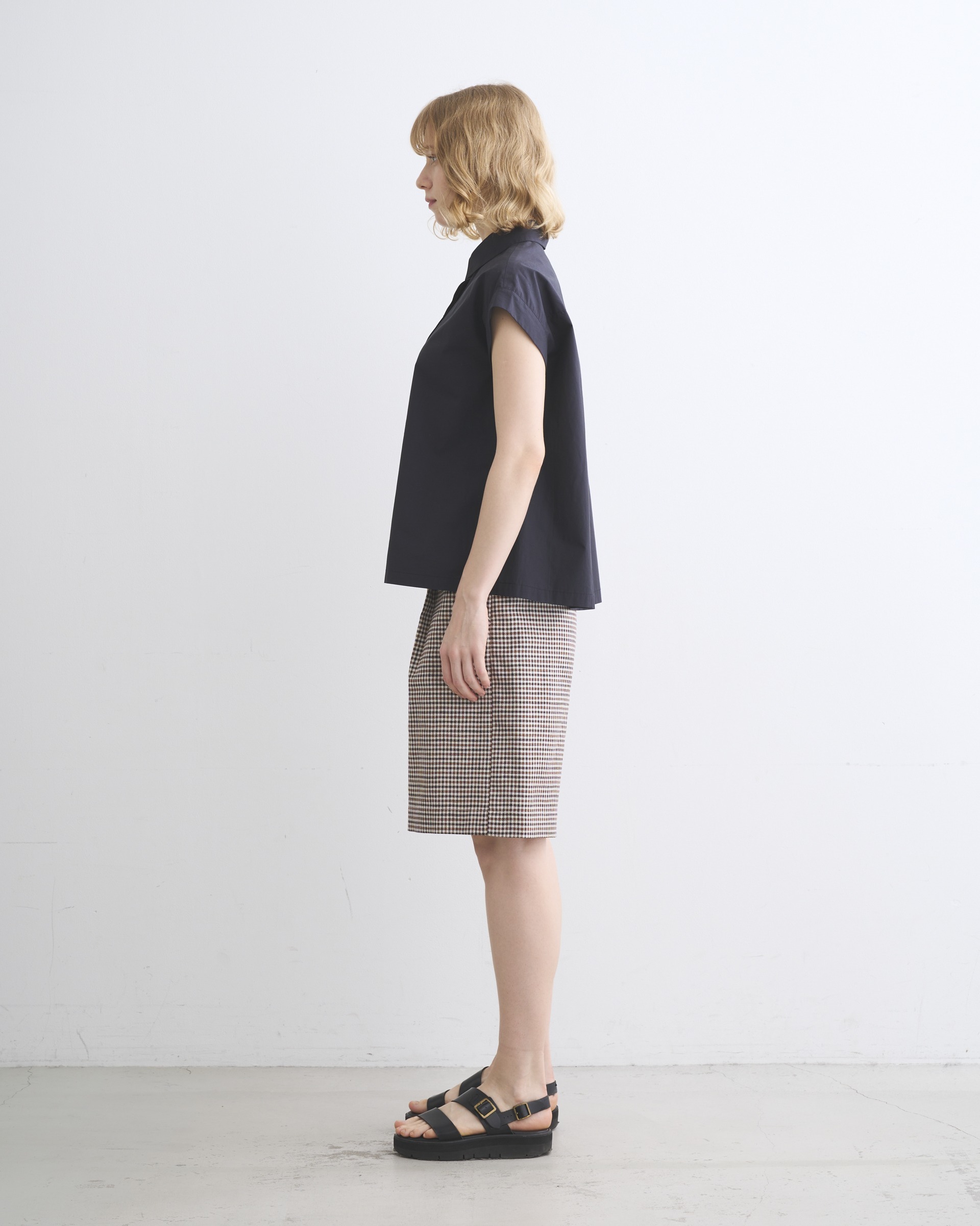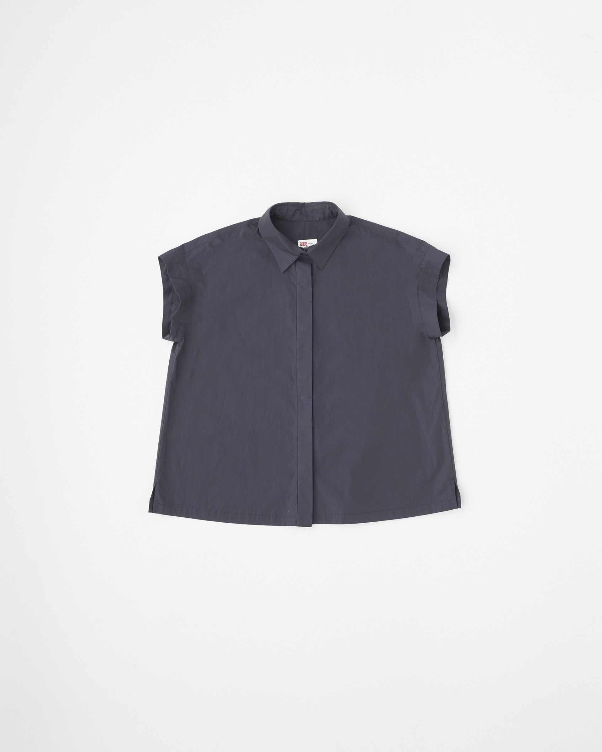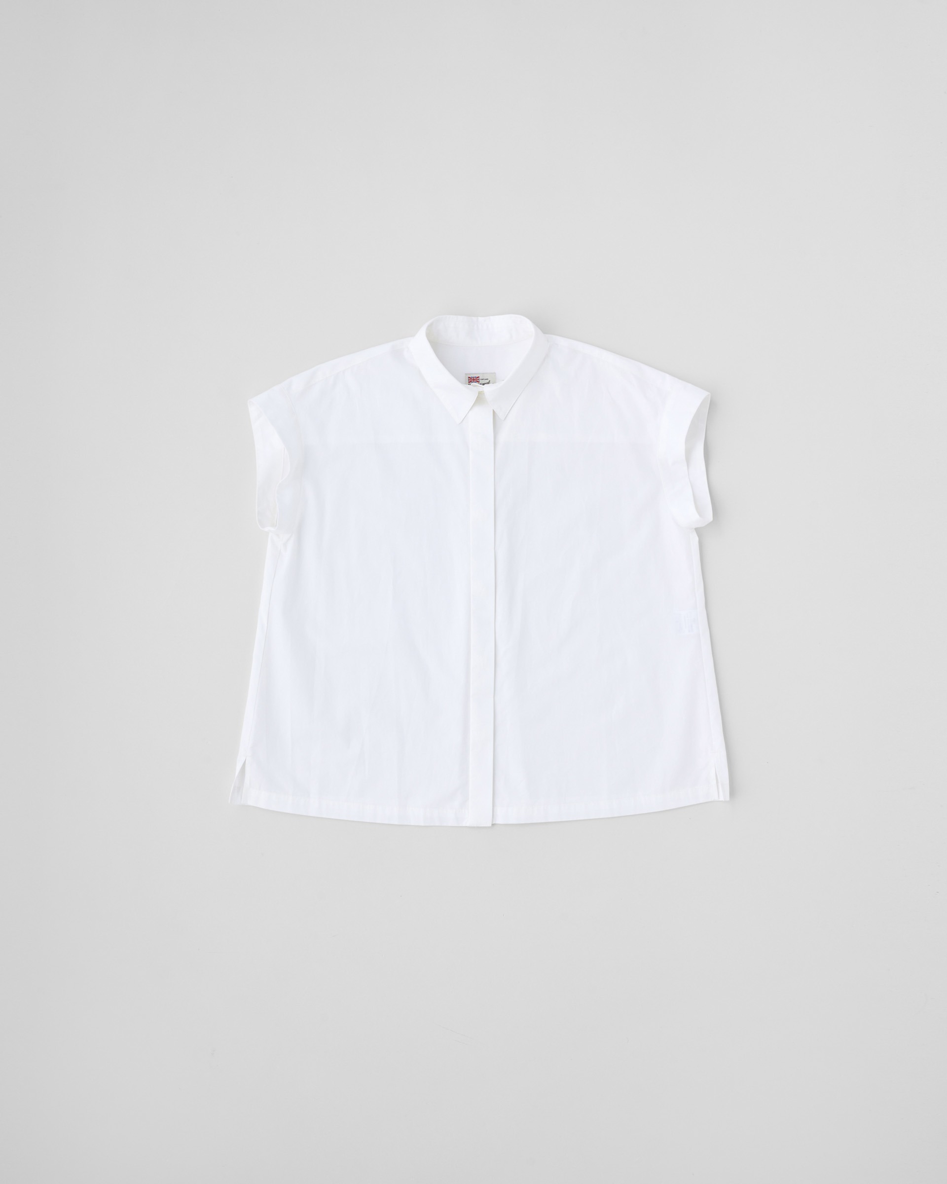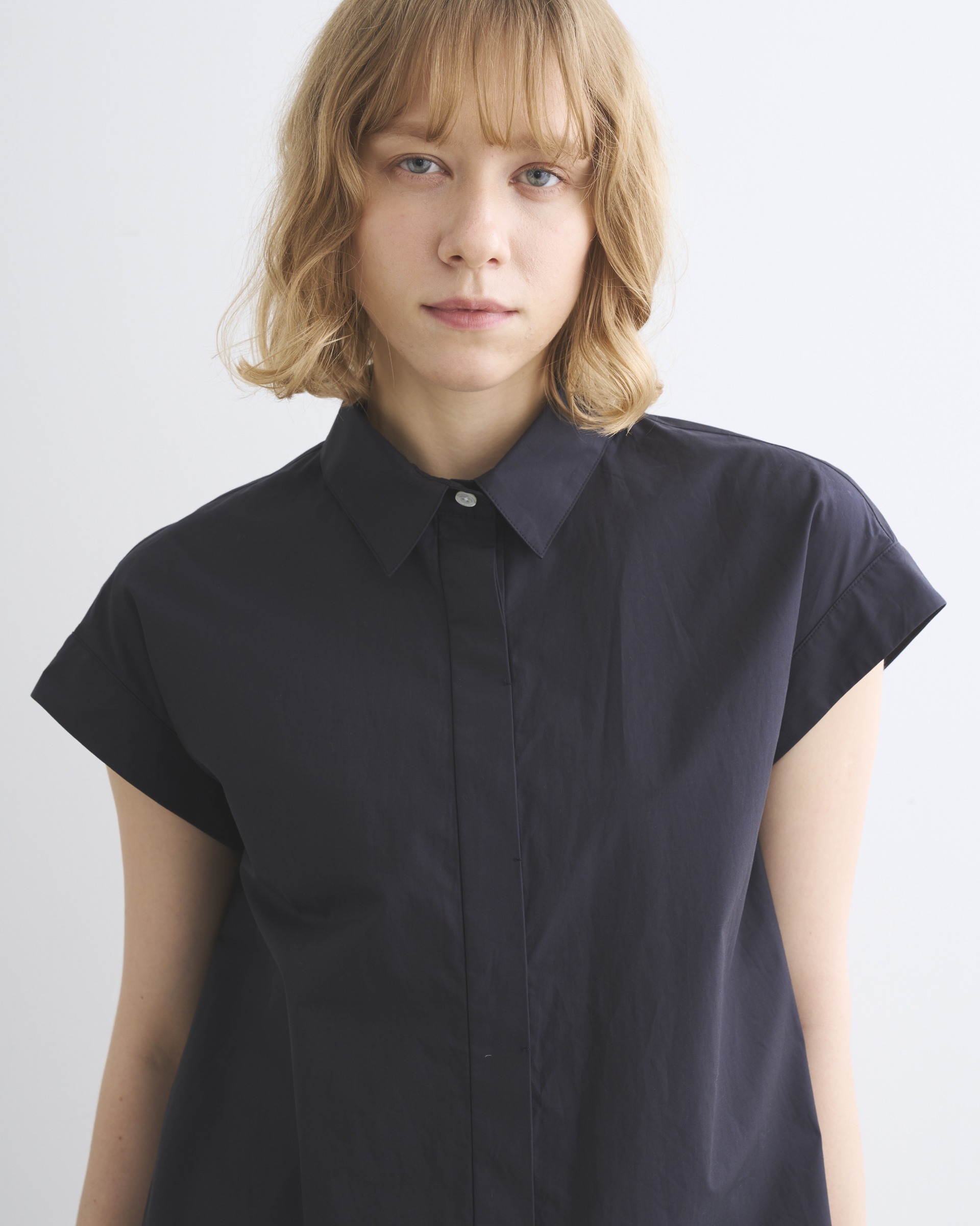 フロントの比翼仕立てがミニマルな印象のノースリーブのブラウス、WIGMORE(ウィグモア)が新登場。 こちらは、すっきりとした肩回りとコンパクトな着丈が特長のクリーンなブラウスです。小さな襟と比翼仕立てのフロント仕様がエレガントな印象に。上質なコットンの糸を高密度に織り上げたハリのあるタイプライター素材を使用しているので、立体的なシルエットが際立ちます。