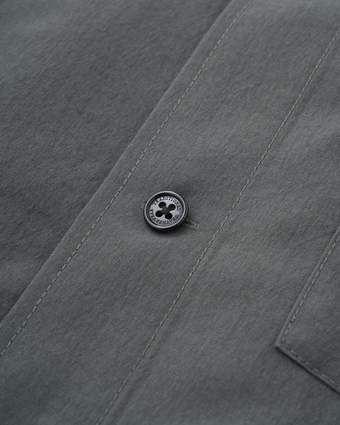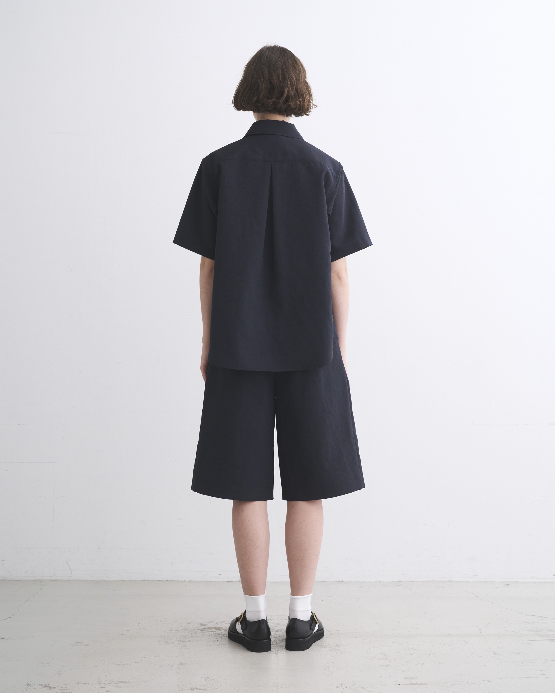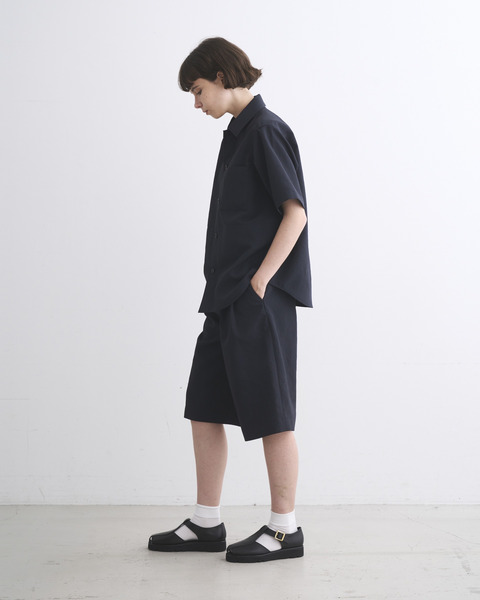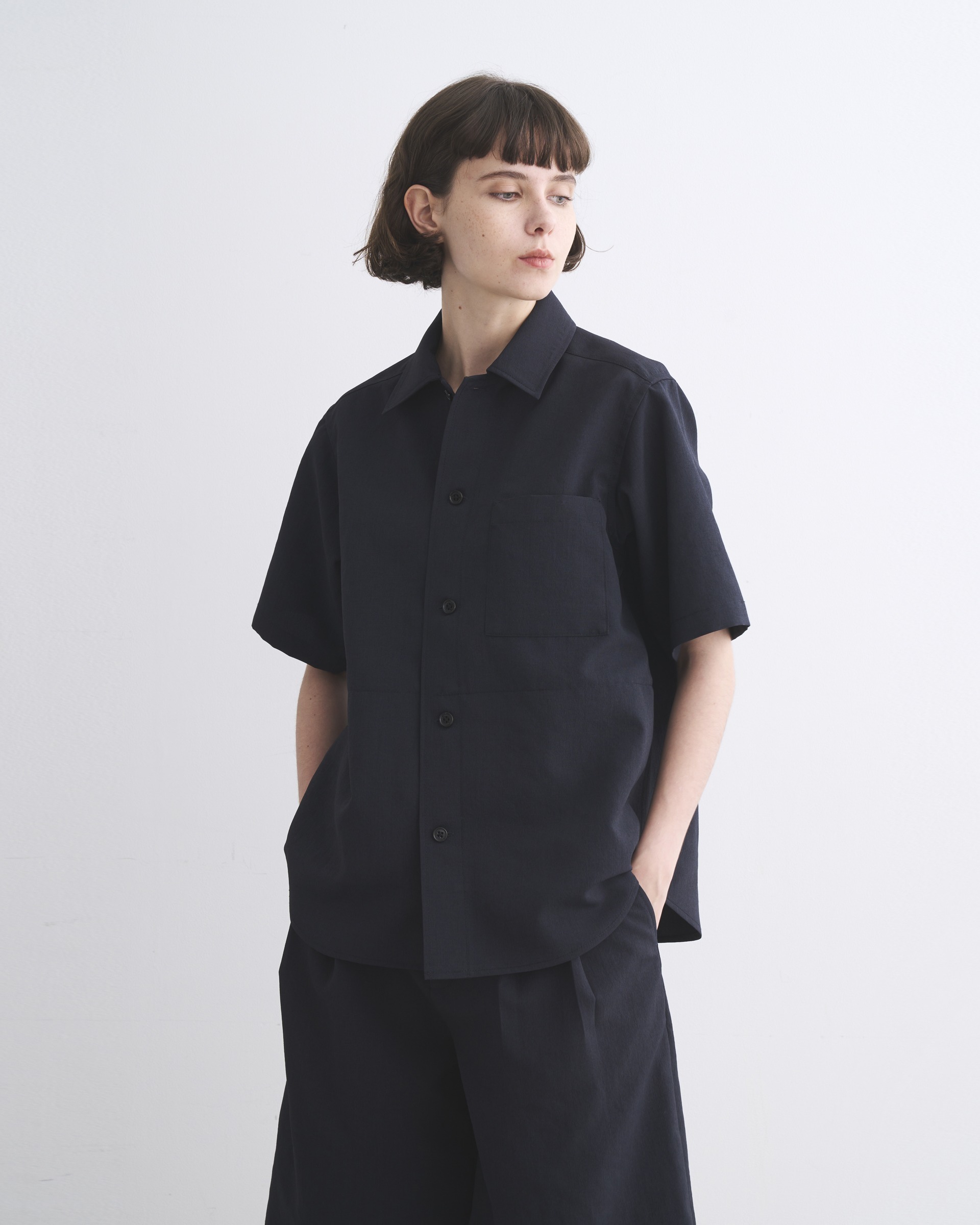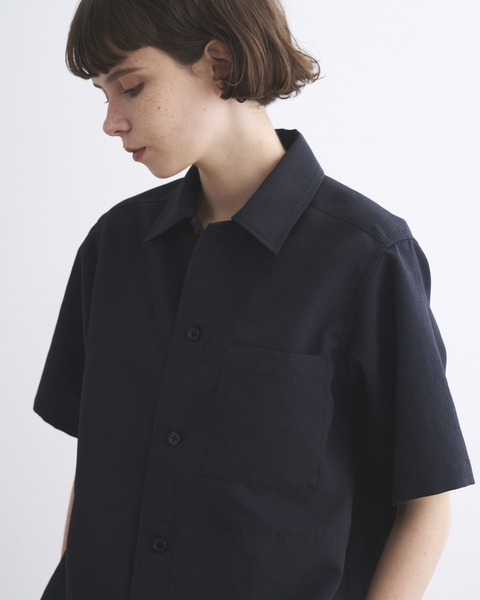 程よくドロップしたショルダーラインとボクシーなシルエットが魅力で、腰にポケットが付いているので羽織りとしても活躍するハーフスリーブシャツです。中が空洞のポリエステルの糸(中空糸)で丁寧に織られたPY素材製なので、きめ細やかで少し光沢のあるリュクスなムードがあって、さらさらした手触りで驚くほどの軽さが魅力です。ハリのあるシャツ地から生まれる立体的なシルエットが、抜け感のある一着です。