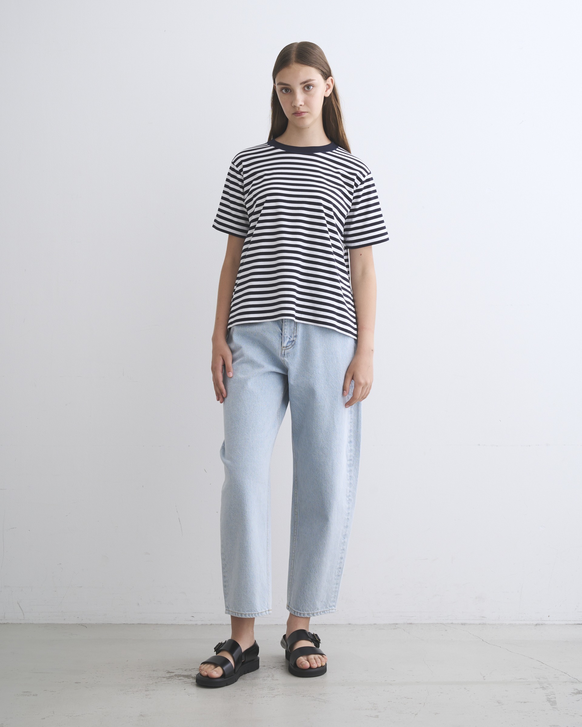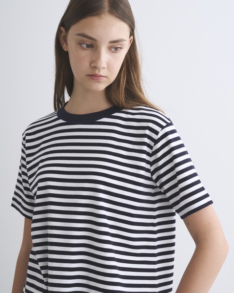 こちらのメイヒルは、すっきりとした身幅でありながらも程良く可動域があるスタンダードなシルエットです。カジュアルなデニムから、キレイ目なウールパンツまで、どんなスタイルでもキマる、着る人を選ばない万能Tシャツです。水中で特別な起毛を施したコットン素材を採用しており、柔らかくしっとりした風合いが魅力で、インナーにもアウターにも活躍します。スムースと呼ばれる横に伸縮する編み方なので、レギュラーシルエットでも動きやすく、ストレス無く着用できる一着です。