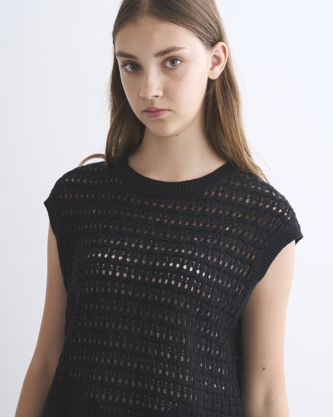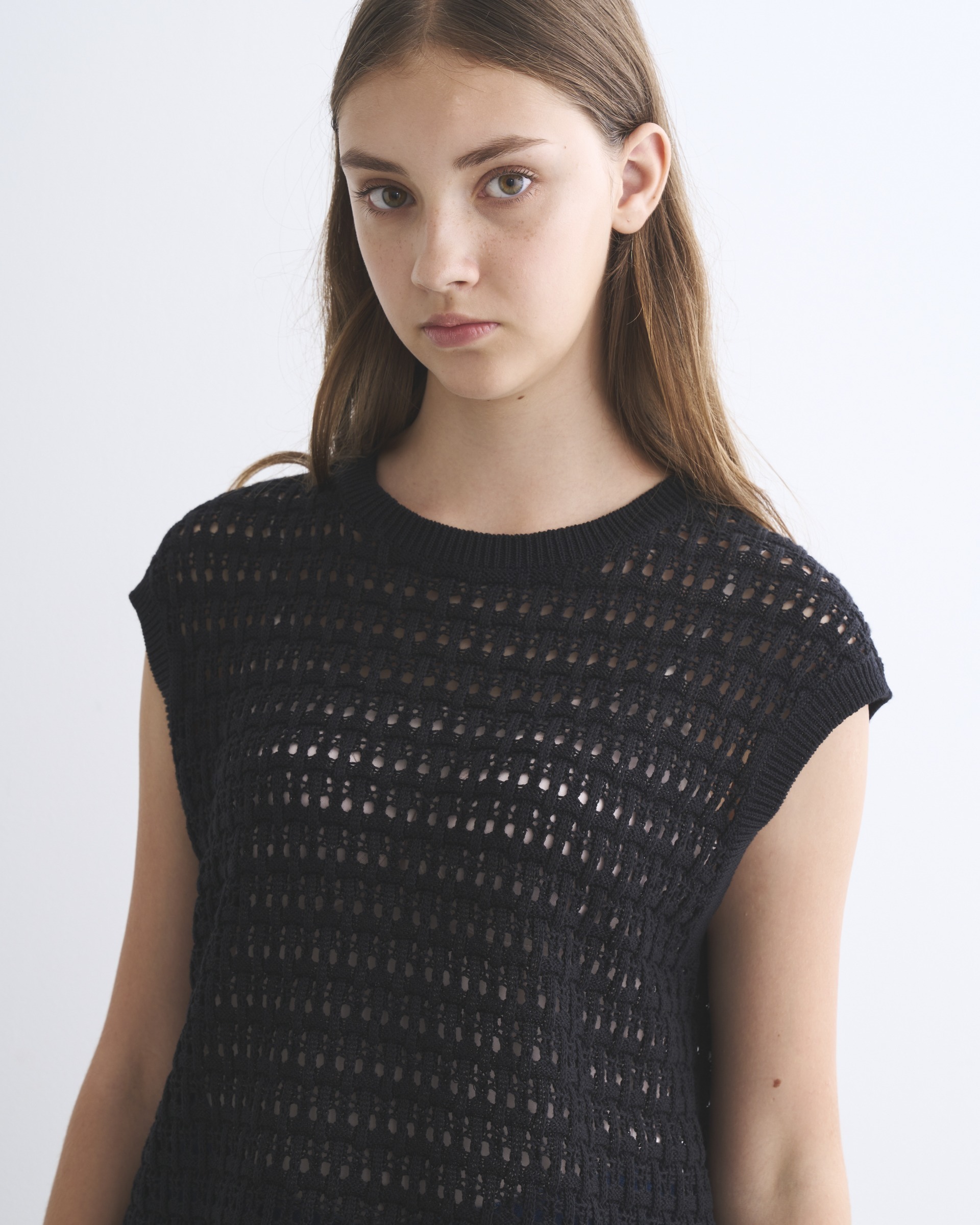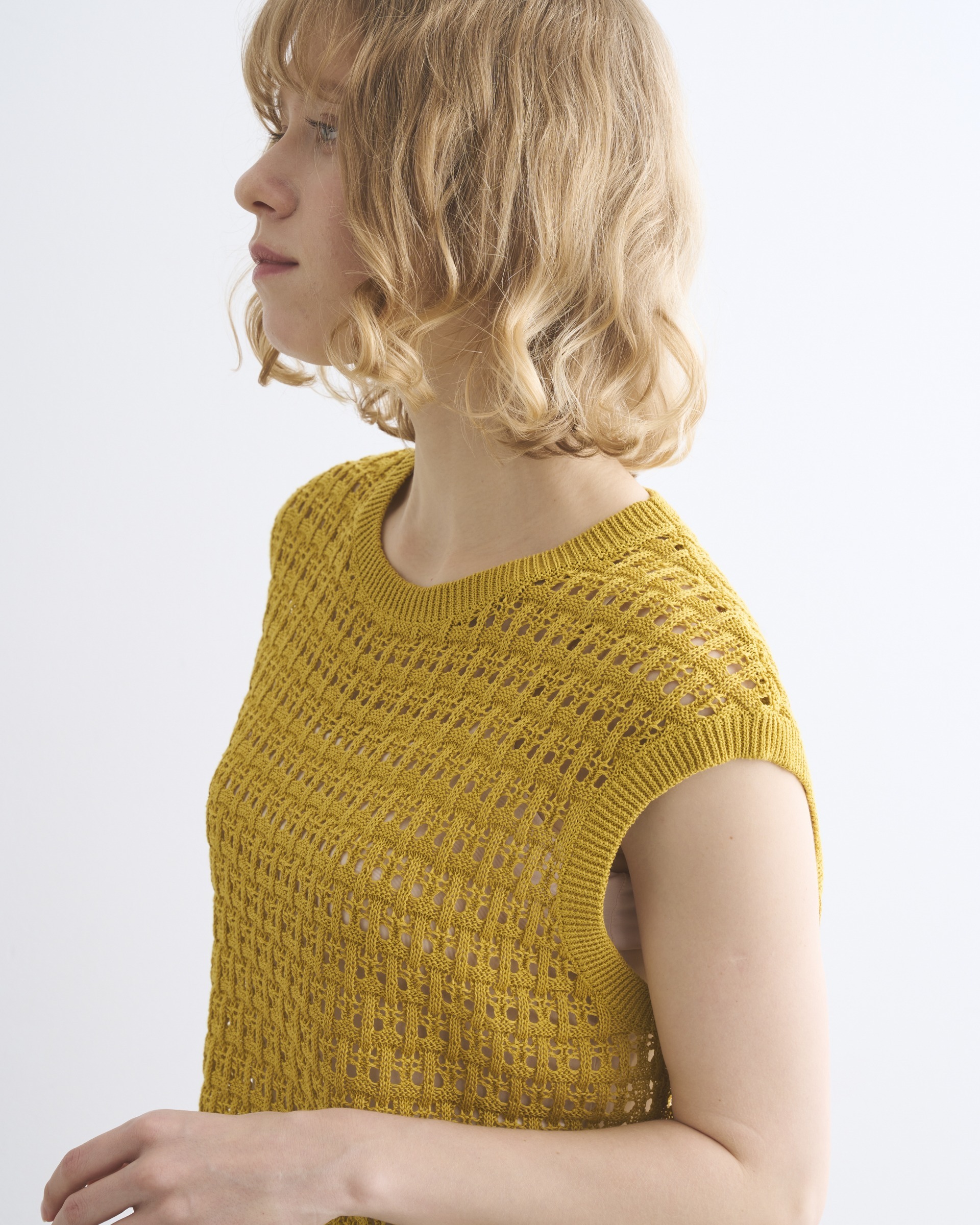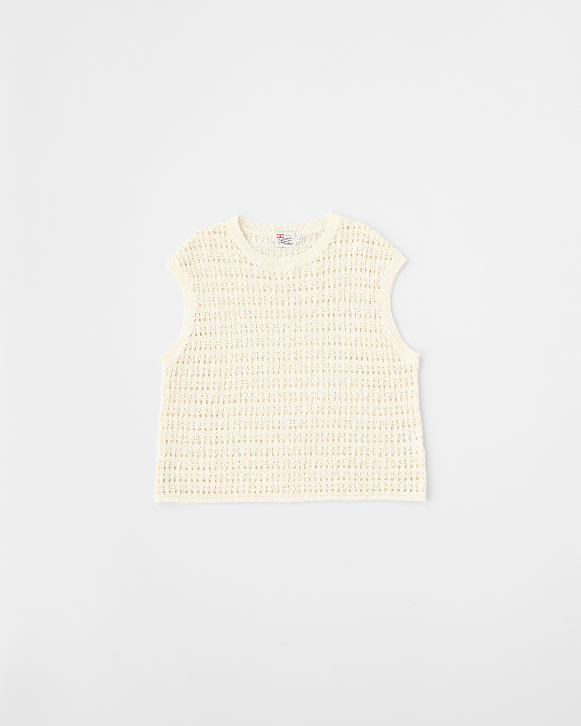 清涼感のあるレース編みのクルーネックベスト、マゴ―が新登場。 コットンの糸を丁寧にアイレット柄に編むことで、透け感のあるレトロなムードのベストが生まれます。すっきりしたシルエットや、コンパクトな着丈が魅力で、クリーンでモダンな印象を与えます。コーディネートがシンプルになりやすい夏のレイアードに最適な一着です。