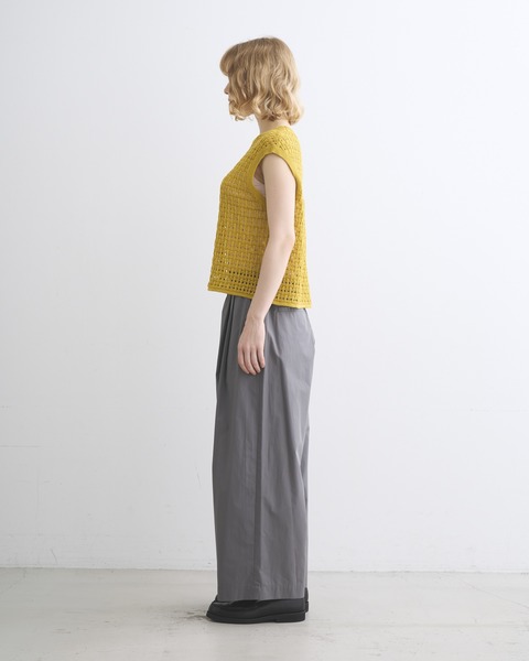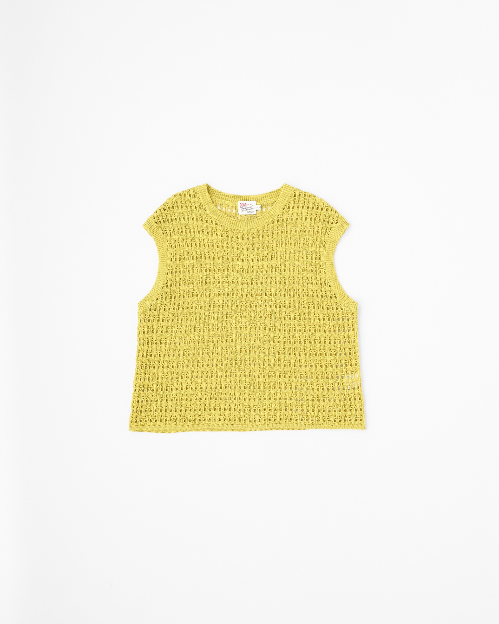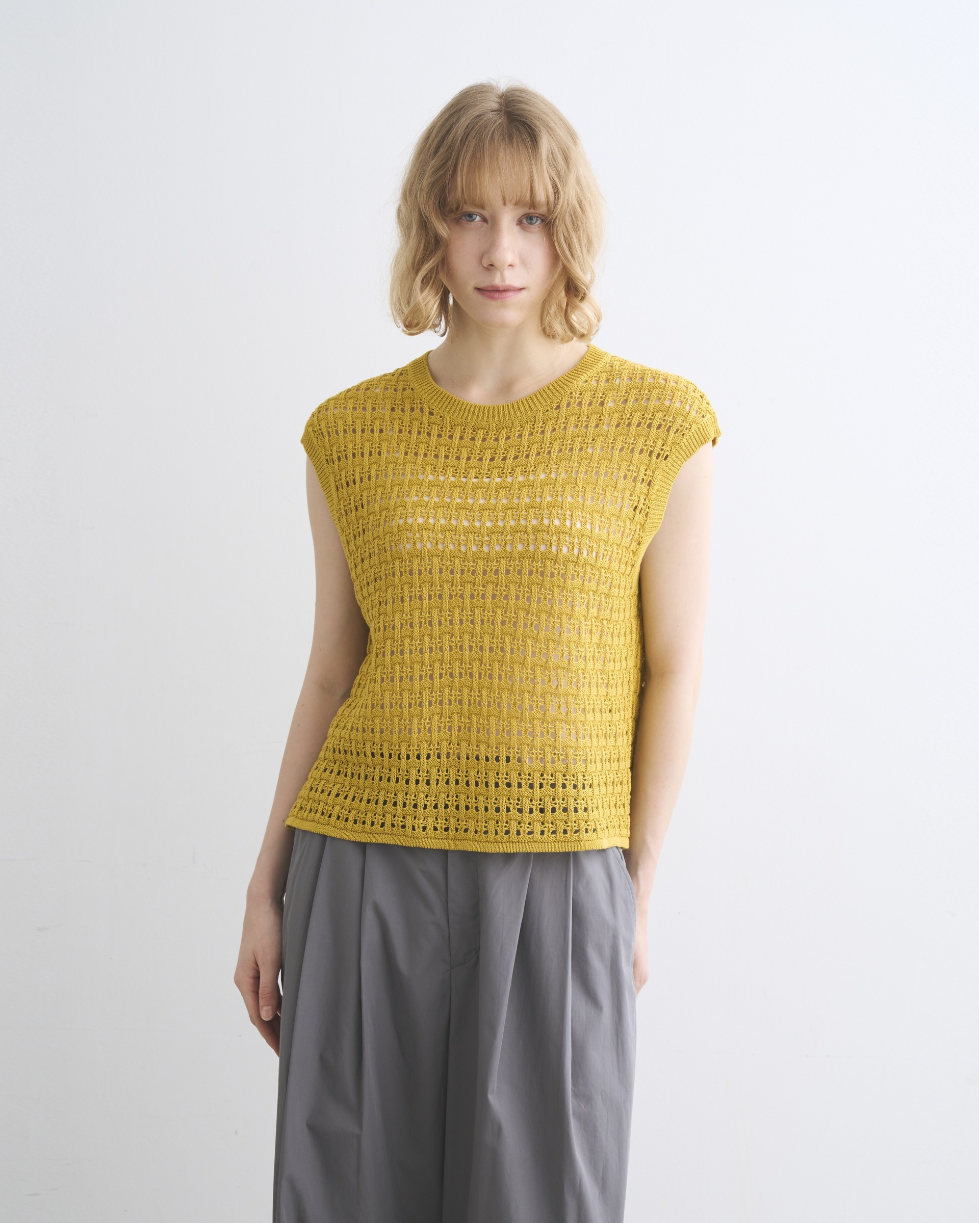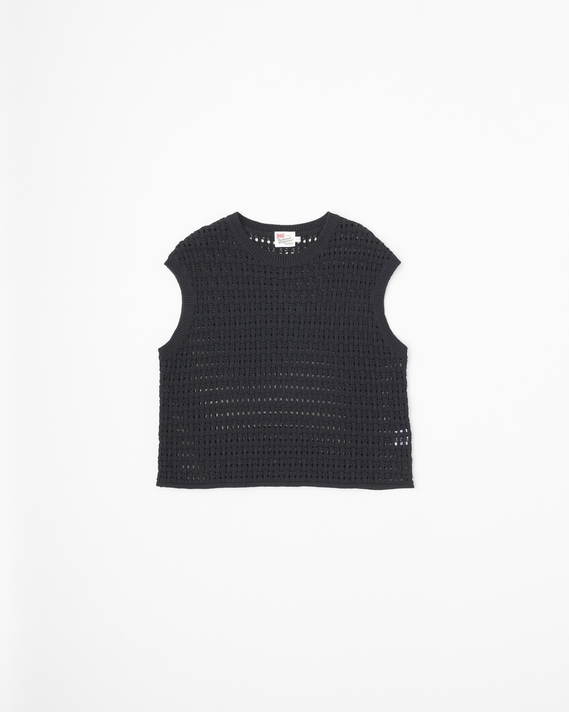 清涼感のあるレース編みのクルーネックベスト、マゴ―が新登場。 コットンの糸を丁寧にアイレット柄に編むことで、透け感のあるレトロなムードのベストが生まれます。すっきりしたシルエットや、コンパクトな着丈が魅力で、クリーンでモダンな印象を与えます。コーディネートがシンプルになりやすい夏のレイアードに最適な一着です。