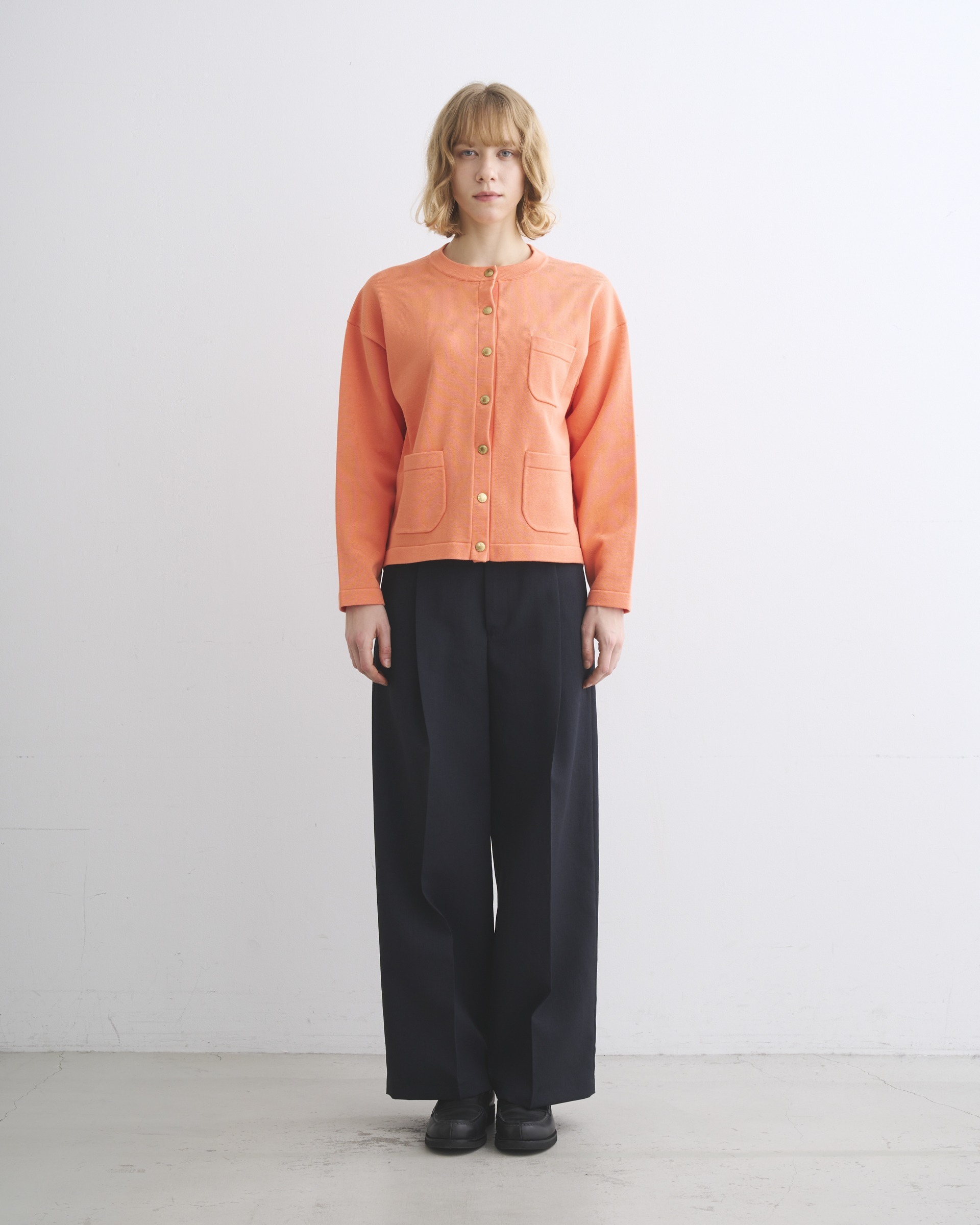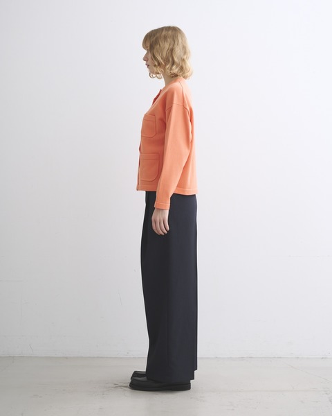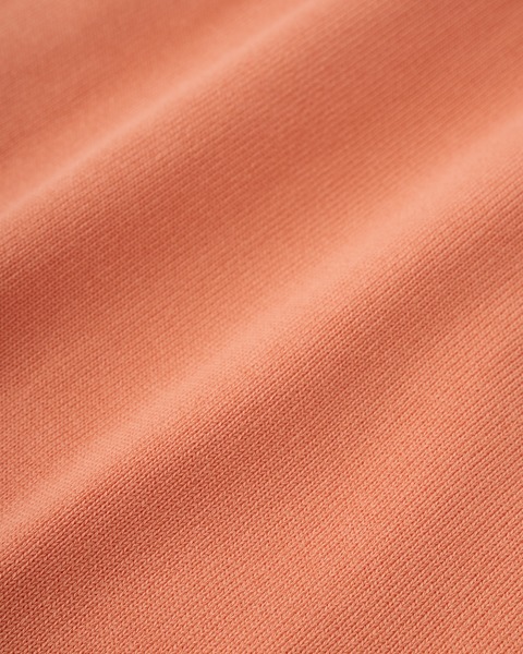 コットンとポリエステルをバランスよく用いて高密度に編むことで、ハリと軽さと発色の良さを叶えたアウターウェアのような仕上がりのニットが生まれます。クルーネックに少しゆったりめなボクシーなシルエットが、クリーンですっきりとした印象を与えます。