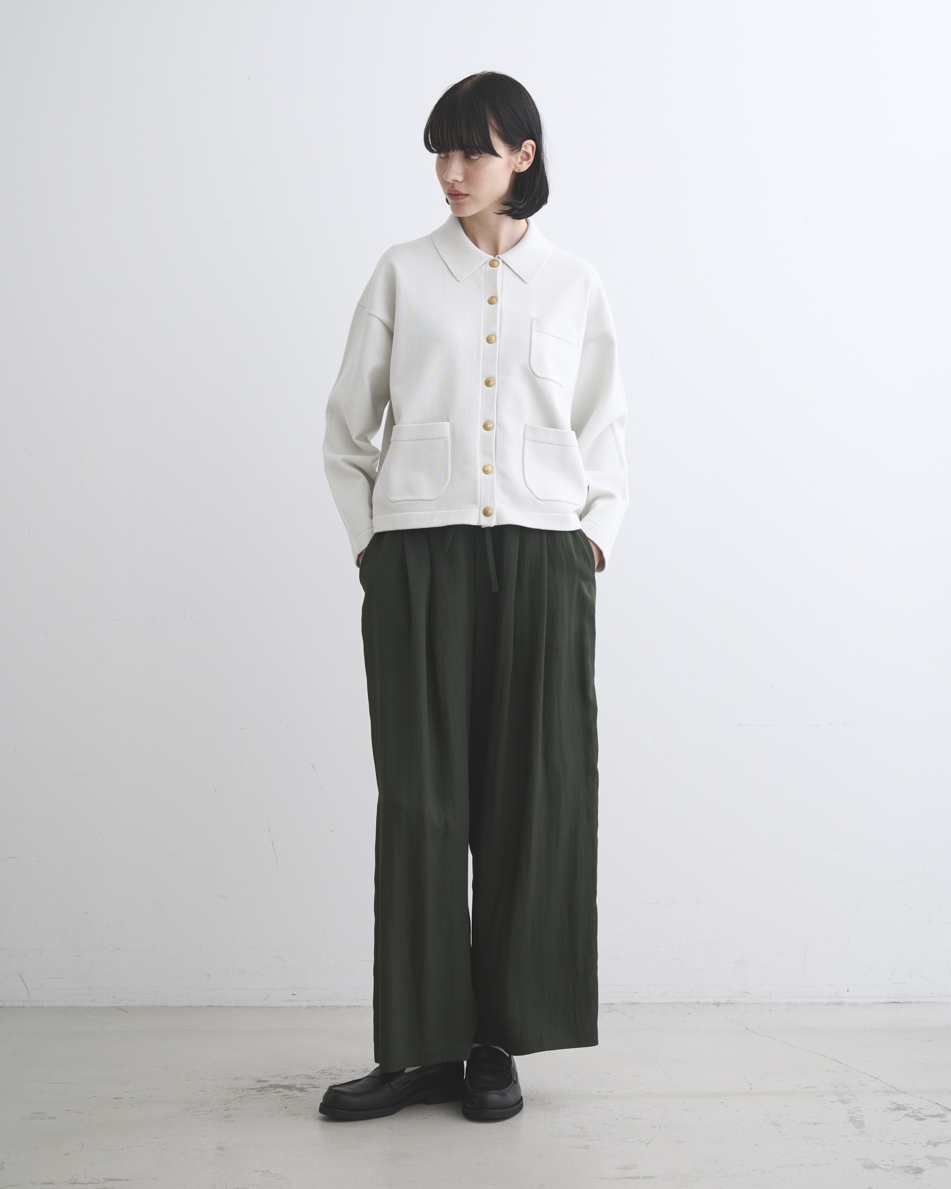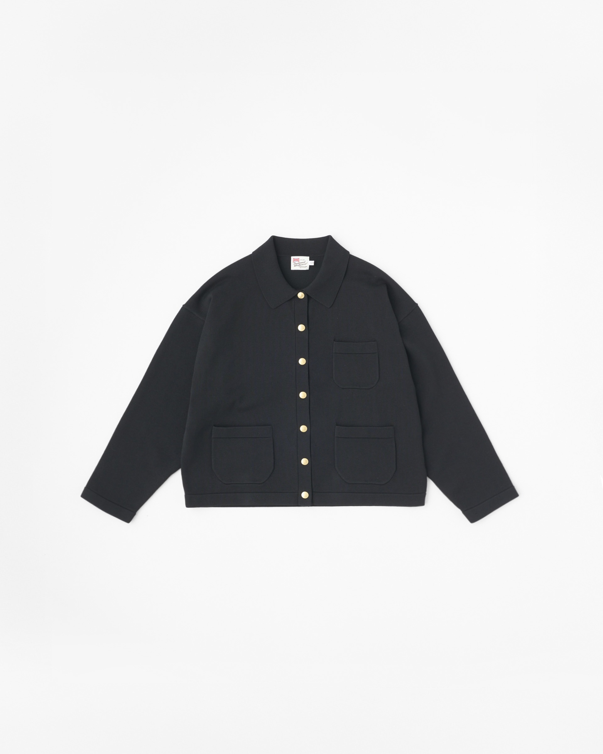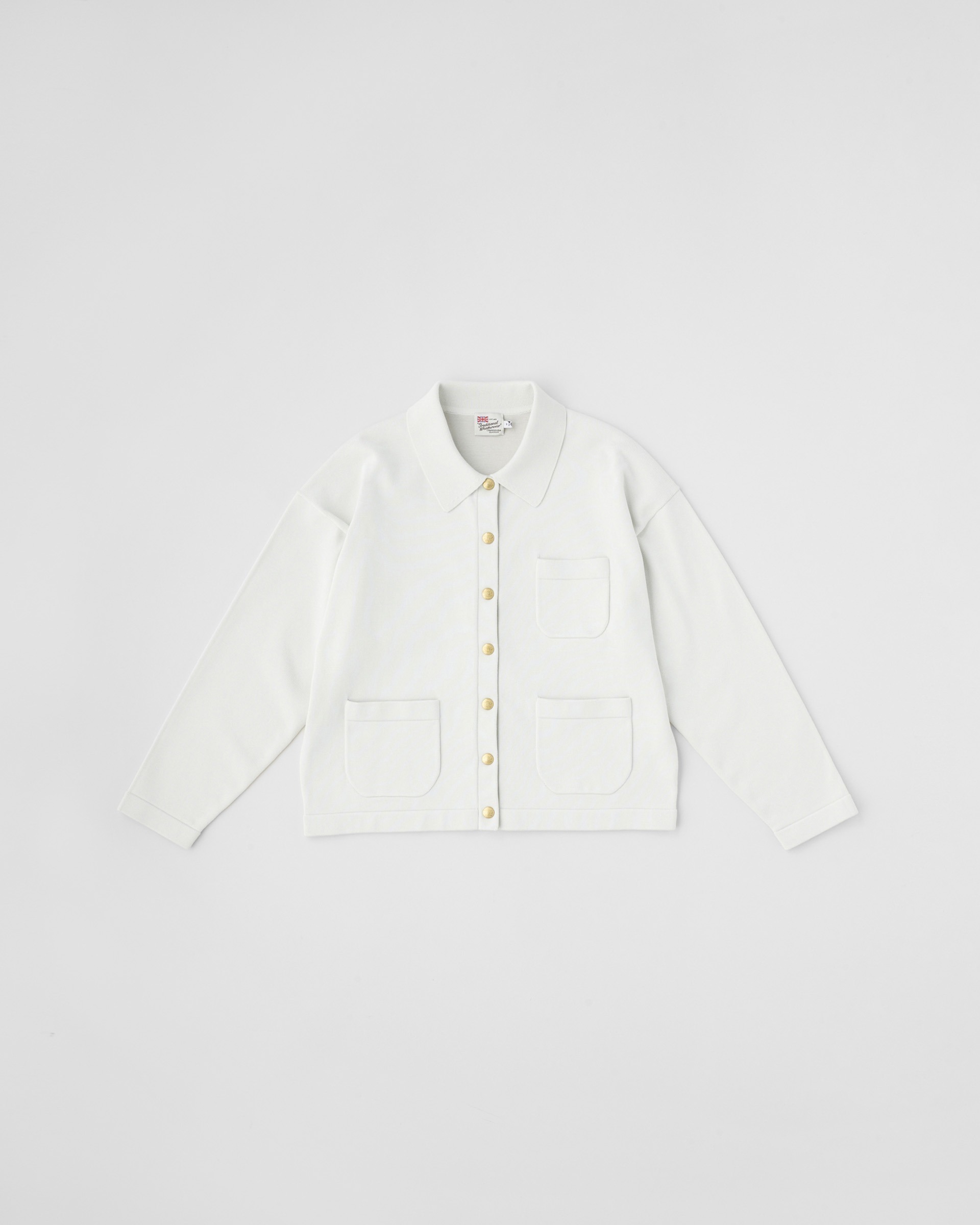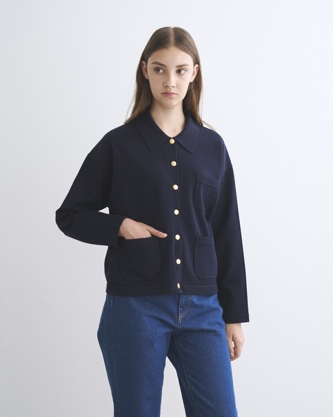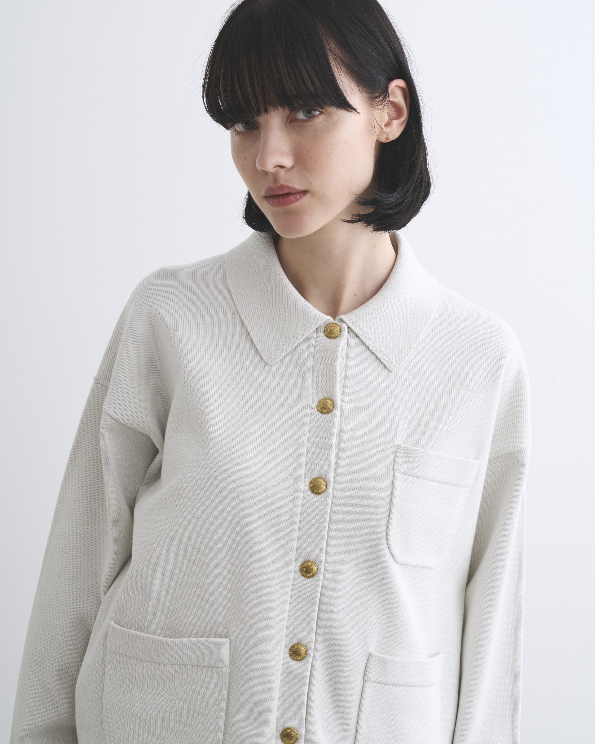 コットンとポリエステルをバランスよく用いて高密度に編むことで、ハリと軽さを叶えたアウターウェアのような仕上がりのニットが生まれます。レギュラーカラーに少しゆったりめなボクシーなシルエットが、クリーンですっきりとした印象を与えます。